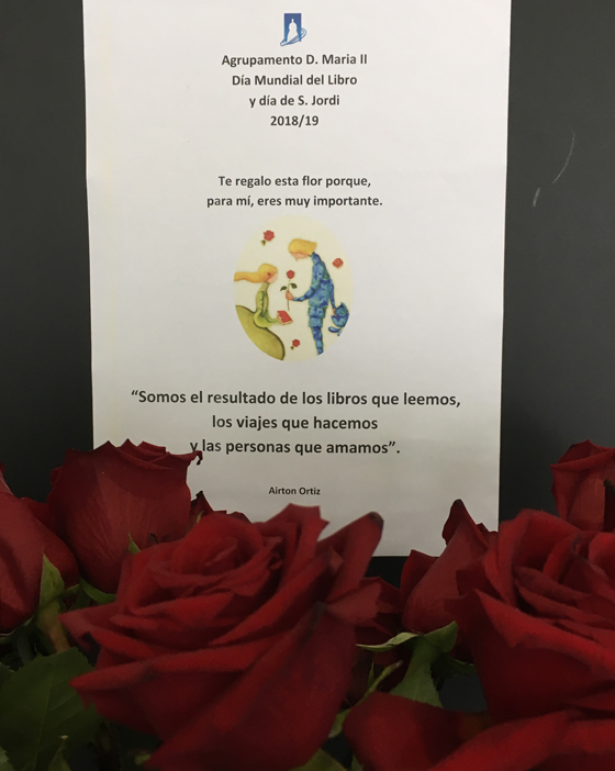 Cumprindo a tradição, os alunos distribuíram pela comunidade escolar rosas vermelhas naturais, acompanhadas por um marcador de livro com a mensagem “Te regalo esta flor porque, para mí, eres muy importante”, onde também se pode ler a romântica lenda de S. Jordi a evidenciar o triunfo da coragem e do amor.
