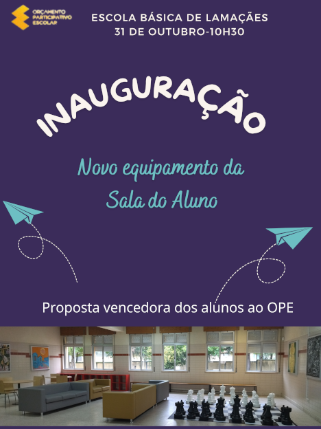 É com enorme orgulho que lhe endereçamos o convite para participação na Inauguração da Sala do Aluno da Escola Básica de Lamaçães, após concretização do Projeto "Aprender, Conectar e Inspirar", OPE24/PROP0017 Orçamento Participativo Escolar – Edição 2024/2025 promovido pela Câmara Municipal de Braga:
