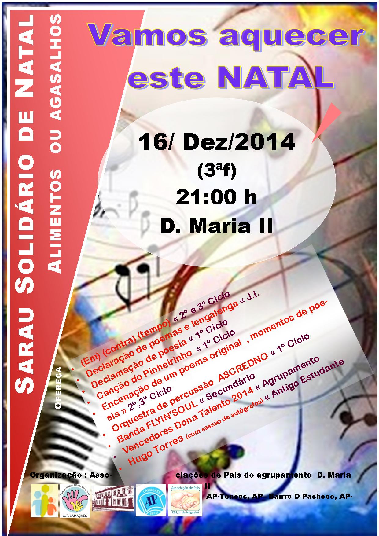 As Associações de Pais das Escolas do agrupamento D. Maria II, em colaboração com os professores, funcionários, alunos e restante comunidade escolar, vem convidá-lo (a) a passar uma noite agradável num Sarau de Natal Solidário - 2014, com o tema "Vamos aquecer este Natal". Terá lugar no próximo dia 16 de dezembro (3ª feira), pelas 21h00, na Escola D. Maria II.